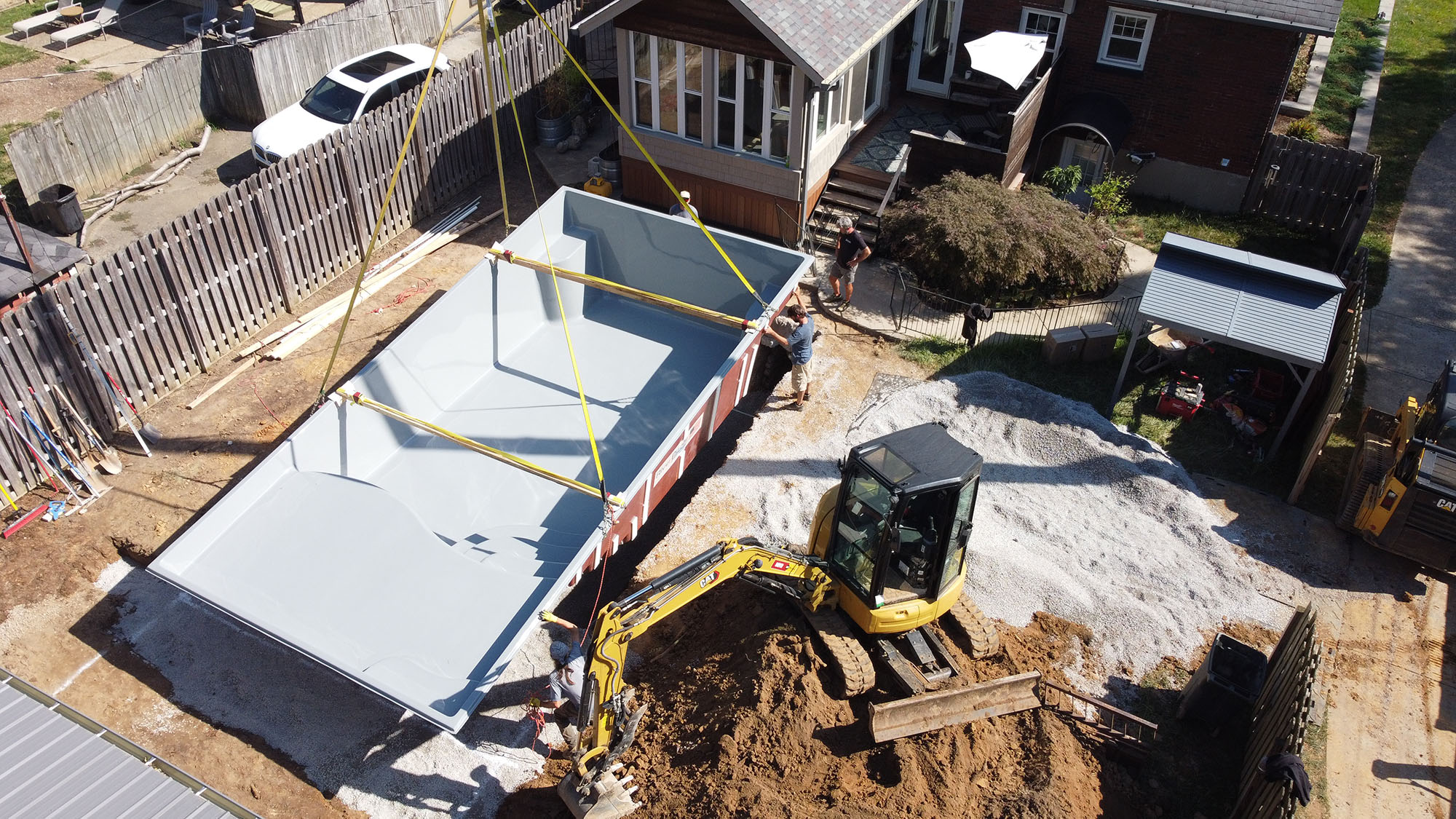 Once the hole is dug, the fiberglass shell is carefully lowered into place using a crane.